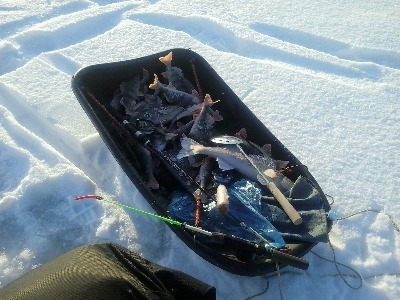 Добрый вечер ,коллегам!!! Вчера хотели ехать на ГЭС (на гряду или высоковольтку),но друзья напугали тем,что там всех на обратном пути(перед подъемом) останавливают и составляют протокол ,аж на 2000 руб. + досмотр улова.Поэтому приняли решение ехать по самарке к крестам, и вот мы у домика егеря.Дорога нормальная ,для высоких авто(есть глубокие колеи,но жесткие).На льду снега мало ,ходить,бурить,ехать нормально.Народу немного,по льду ездят даже крузаки.С утра было -25,днем-15,ветра за деревьями практически нет,рыбачить комфортно.С утра одолел судачок,к сожалению мелкий,но иногда влетел едовой.С 11 до 13 ничего ,кроме мелко окуня.Но мои поиски увенчались успехом, и я нашел свою золотую лунку.Брал постоянно возле дна,на разные балансиры . Не берет на стук, помотаю кончиком и сразу поклевка.С ходов немеряно( и щука и судаки),окунь весь зачетный.Глубина под лункой 4,5 метра.Оборвал две рапалы,сломал один тройник,и опять на взмахе следует УДАР.... , и опять сломал удилище.Больше Салмо брать не буду.Рыбалкой остались довольны,улов составил около 4 кг.