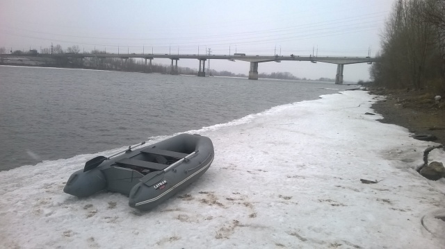 В субботу 4 апреля с Дм900 открывали сезон ловли с лодки.Спуск к воде еще во льду,поэтому отцепляли телегу и вручную докатывали по льду до воды,там сбрасывали лодку.Волга встретила свеженьким западным ветерком и волной.