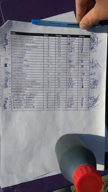 Уклейка первые пол часа клевала замечательно, но потом были очень большие провалы. Иногда сидел без поклевки по 5-7 минут. Весь тур упирался только в нее. Менял горизонт, насадку, но работал только мотыль и самый рабочий горизонт был 25-30 см. Поймал 2600 с чем-то грамм. Занял первое место. Поздравляю Зуфара со вторым местом и Кирилла с третьим)