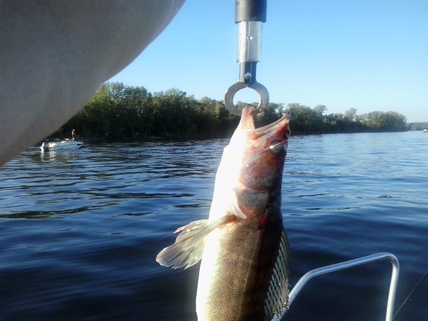 Не долго думая, отхожу на 30-35 м под углом, примерно в 45 градусов выше по течению, делаю заброс перпендикулярно течению с расчетом на снос приманки. Отчетливо чувствую как бель трется по леске. Приманку выносит за стаю и сразу следует хорошая поклевка. Щука на 2.2 кг у меня на борту. Больше поклевок не было вобще ни тут ни в других местах. Судак почему то не ест, хотя он точно присутвовал, об этом свидетельствуют показания эхолота.