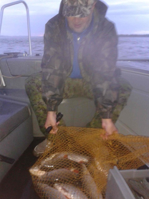 ! Напрягал немного постоянно меняющийся ветер, который порой вертел плотики жерлиц со страшной силой. Пока ставили четвертую, на второй - флаг! Илюха подсекает и орёт: "Есть! Хороший!". Тянусь за подсаком, и машинально ловлю в него... окушка! НачАло напоминает рыбалку в среду.