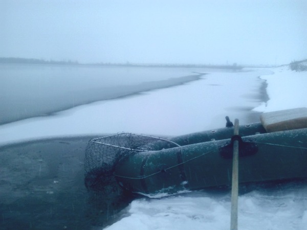 Вчера нам на воде было холодно. Давно так не было, так что бы руки мерзли как на льду! На лодочной нас ждала лодка-сугроб, тент превратился из тканевого в дубовый, зима и слева и справа.