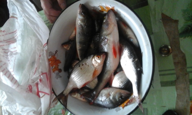 Снял верхнюю козу, так потом ни потычки! И только ближе к отъезду, наконец вытащил несколько съедобных сорожек. Потом опять была хватка кого-то крупного, но опять сход. Наверное потому, что цапнула, как только коза до дна дошла. Я даже толком не подсёк. Но позже всё же вытащил приличную краснопёрку. И на этом у меня всё. У Славы под самый отъезд пошла было хорошая сорога, но он успел поймать всего штук пять. Так что в отношении его, мой прогноз, что клёв начнётся под отъезд, (собирались в 17.30) сбылся.