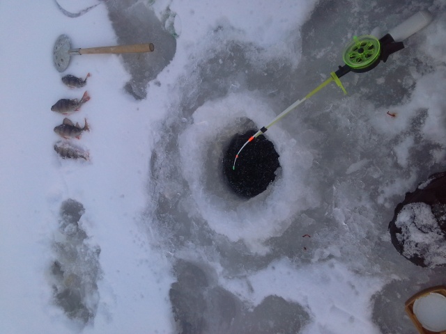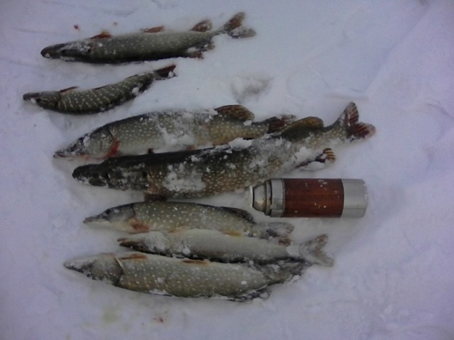 …..люди дома сидят. Короче выставились по 10 жерлиц на глубине..ждем…время 10 утра…ничего! Хрень какая то. Решил шарманишку поискать… 4 башки и всё… много не побегаешь…лед см 5-7…