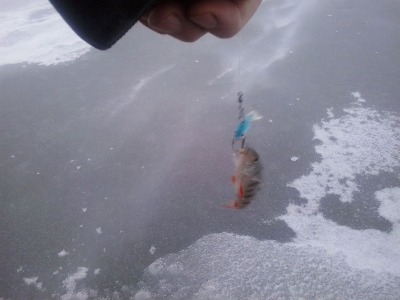 Выставился, напарники по очереди нет-нет, да и вытаскивали то окунька, то сорожечку на свои чуткие снасти. А я сидел, тряс балансиром, кто-то постукивал по нему, но являть свое хитрое лицо на белый свет совсем не желал. Попросил Андрея проверить мою лунку его снастью, а сам пристроился рядом понаблюдать за его игрой. И только специалист опустил мормышку в воду и начал выдавать свои «ступеньки», как последовала вполне заметная поклевка, это был малюпусенький окунек, потом еще один, и еще и еще.