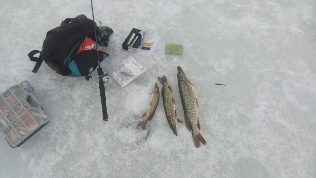 Рыба в основном пока прячется подо льдом. Потопаешь на закраине, а оттуда несколько окуньков убегает. На открытую воду рыба выходит не охотно. Щука немного посмелее. Стоит по свалам в ямы. Она пассивна и вся в пиявках.