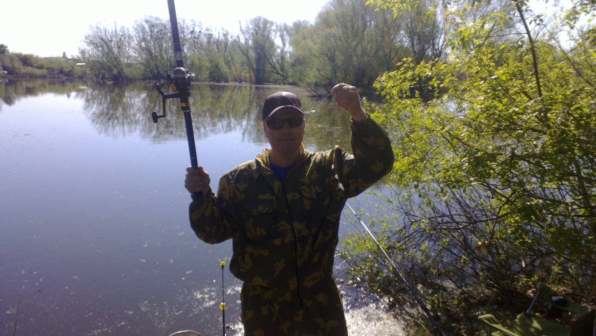 На наш вопрос о наличии карася он ответствовал, что карась мал-помалу клюёт, но размер не очень. Ну да ладно, подумали мы, и то хорошо. И айда снасти-удочки расчехлять да в воду их макать.