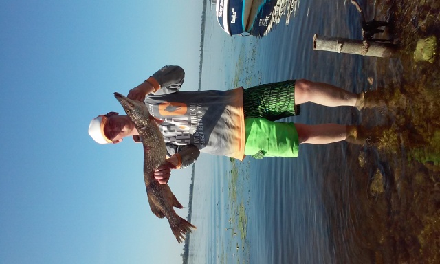 В конце концов папа сказал: -"Хочу домой" - и мы двинулись к берегу где оставили машину. По пути попался свободный от рыбаков и сетей пятачок. Заякорился, прицепил в очередной раз 110-й Орбит, и "пригрозил", что если мол не поймает, то больше его из коробки не достану. Орбит угрозе внял и примерно с 5-го заброса изловил-таки небольшую щучку (сковородка есть!).