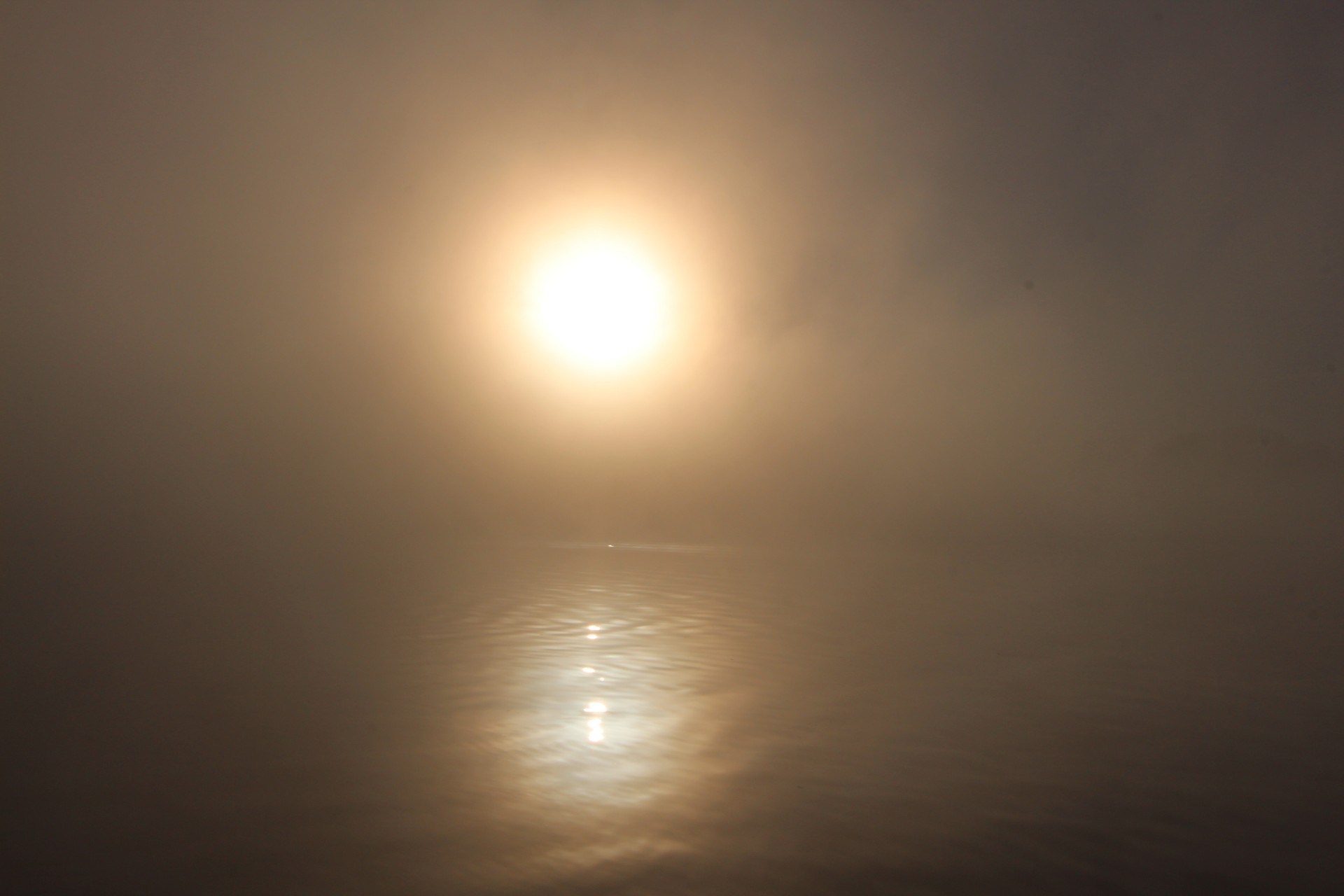 Молочный туман застелил протоку мохнатой шубой – дыхание осени. Резкий контраст температур воздуха 10 гр и воды 24 гр вызвали густой туман.