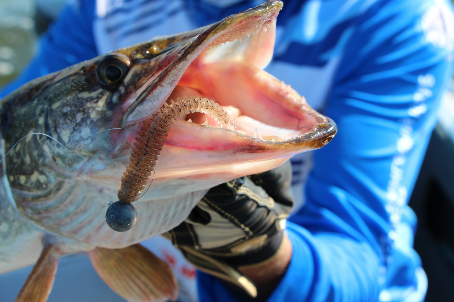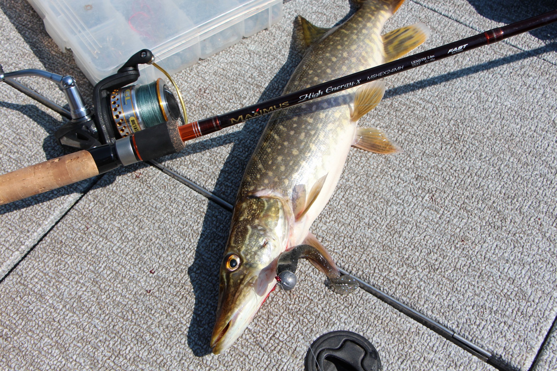 Ловили на крупный крупный силикон. Я ловил на Lunker City SHAKER 6". Поразила жадность мелких щучек. На фото ниже, щучка граммов на 700, шейкер шестёрку заглотила полностью и джиг-головку тоже.