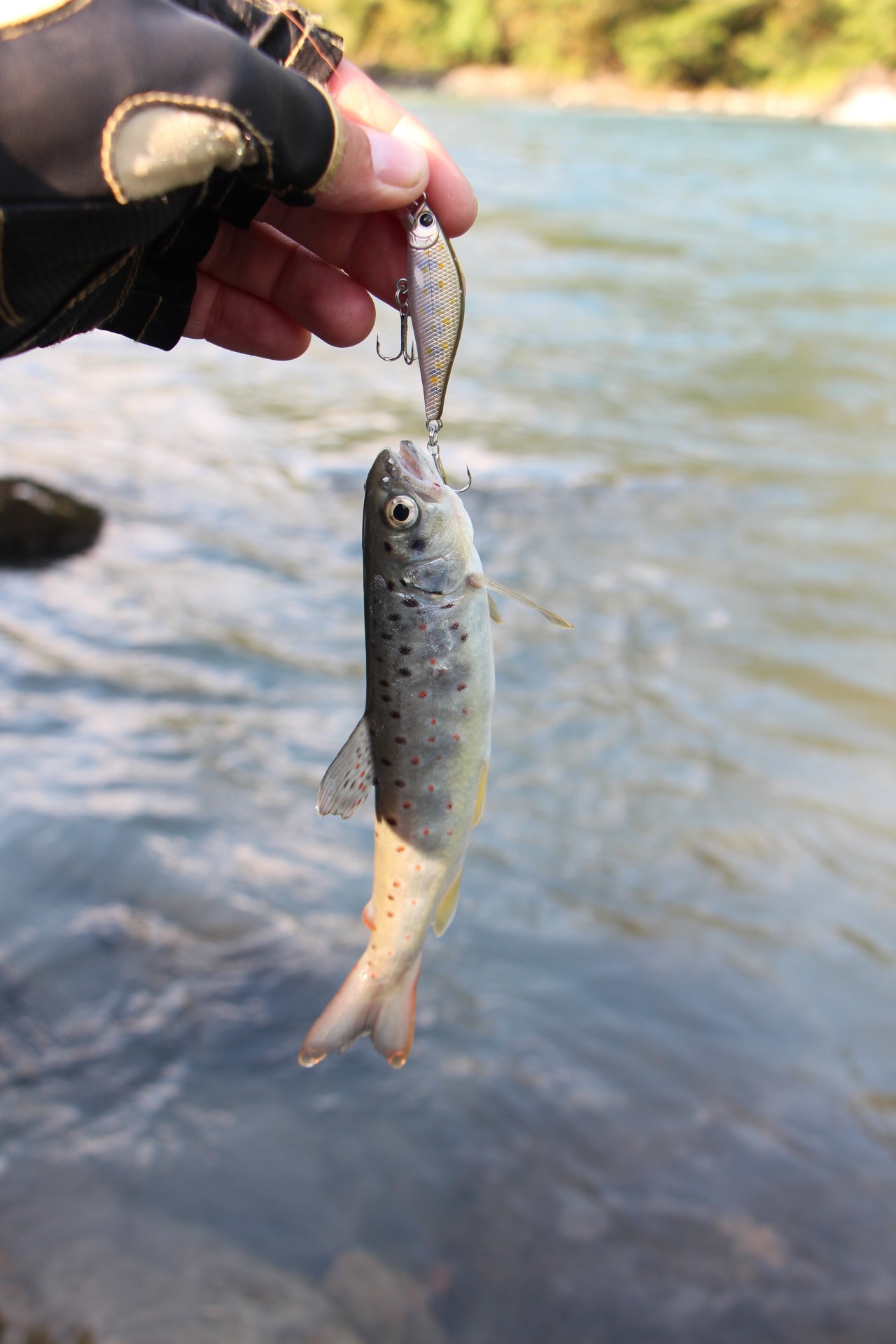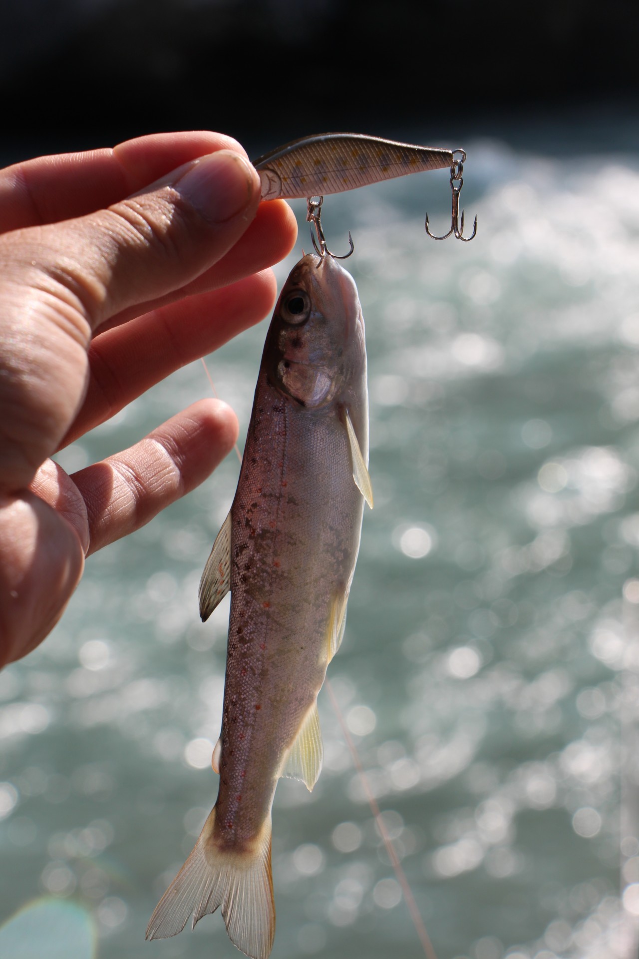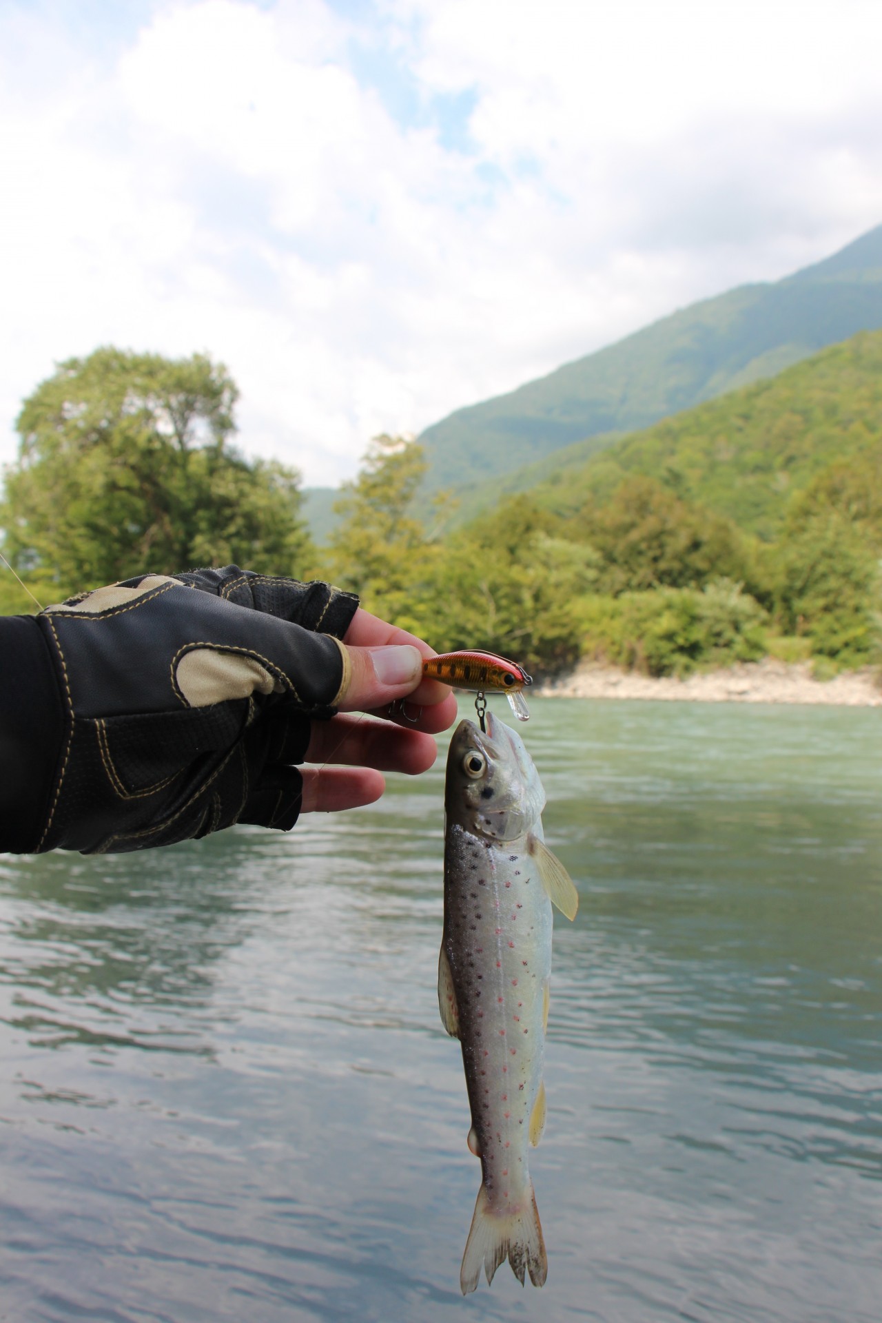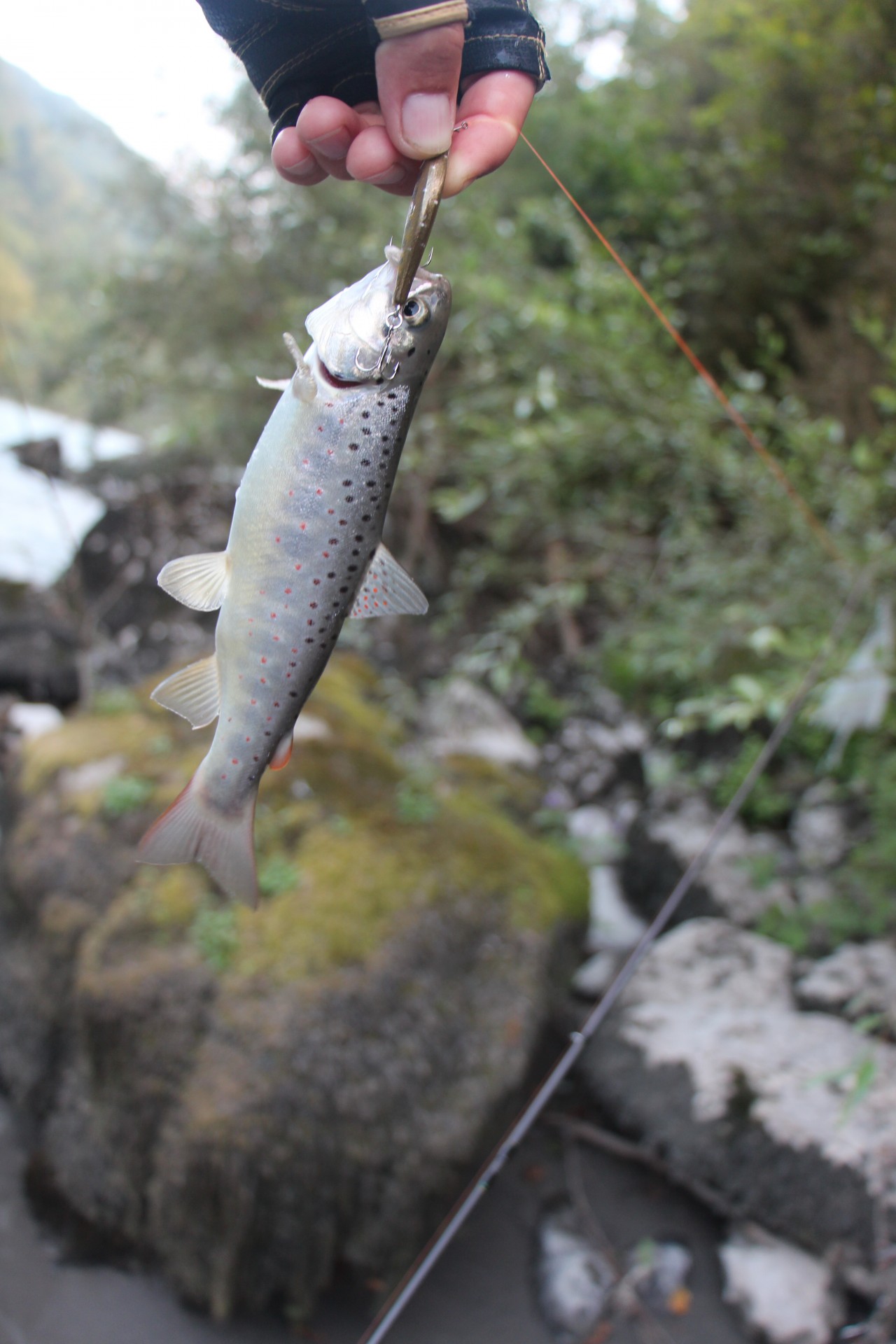 Меняю приманку на тонущий минноу. Проводка вдоль камешков с периодической отдачей вершинки спиннинга. Приманка играет на одном месте, подхваченная течением. Есть!