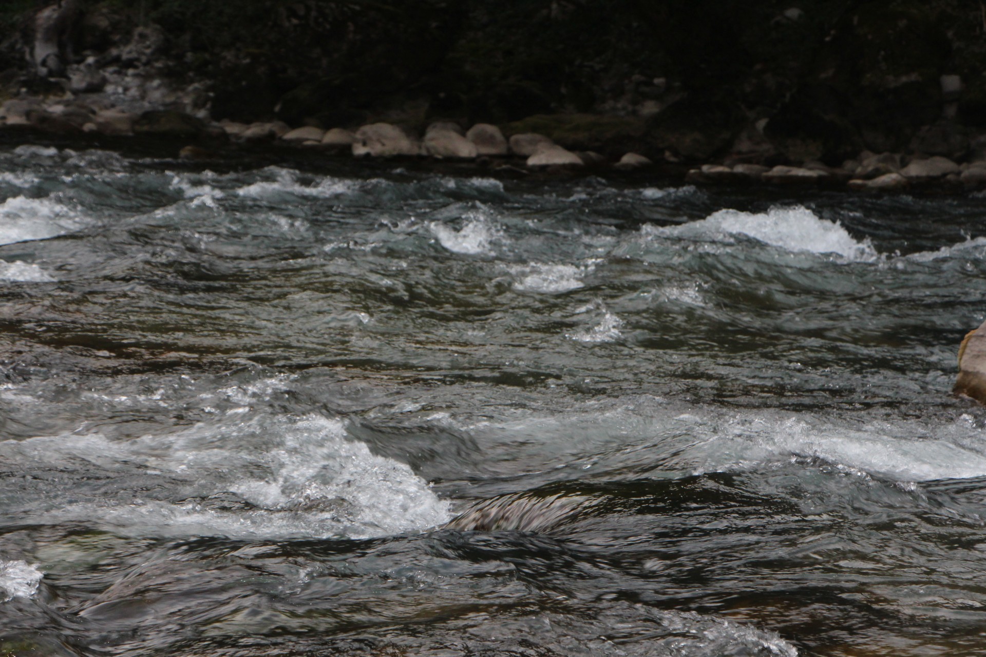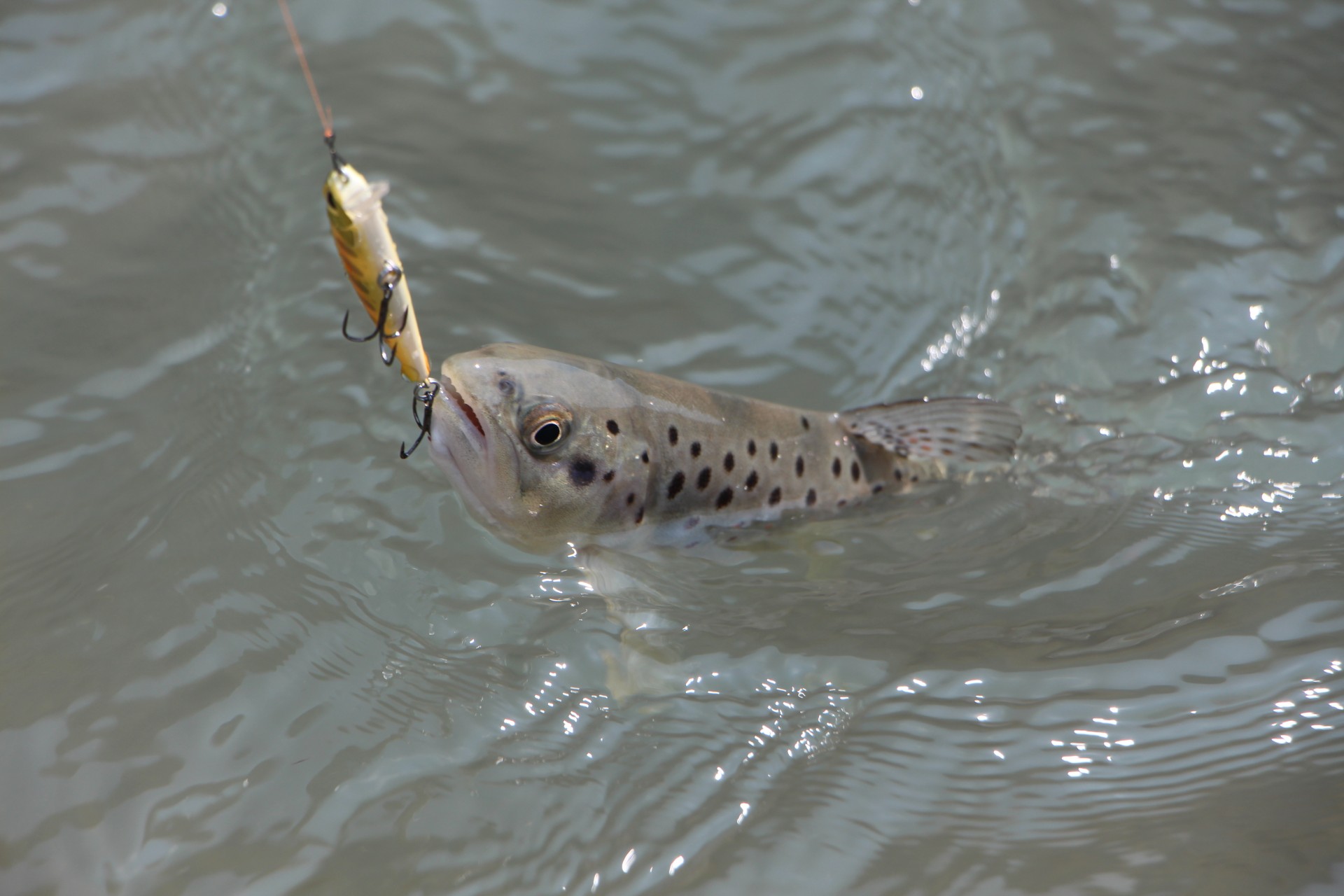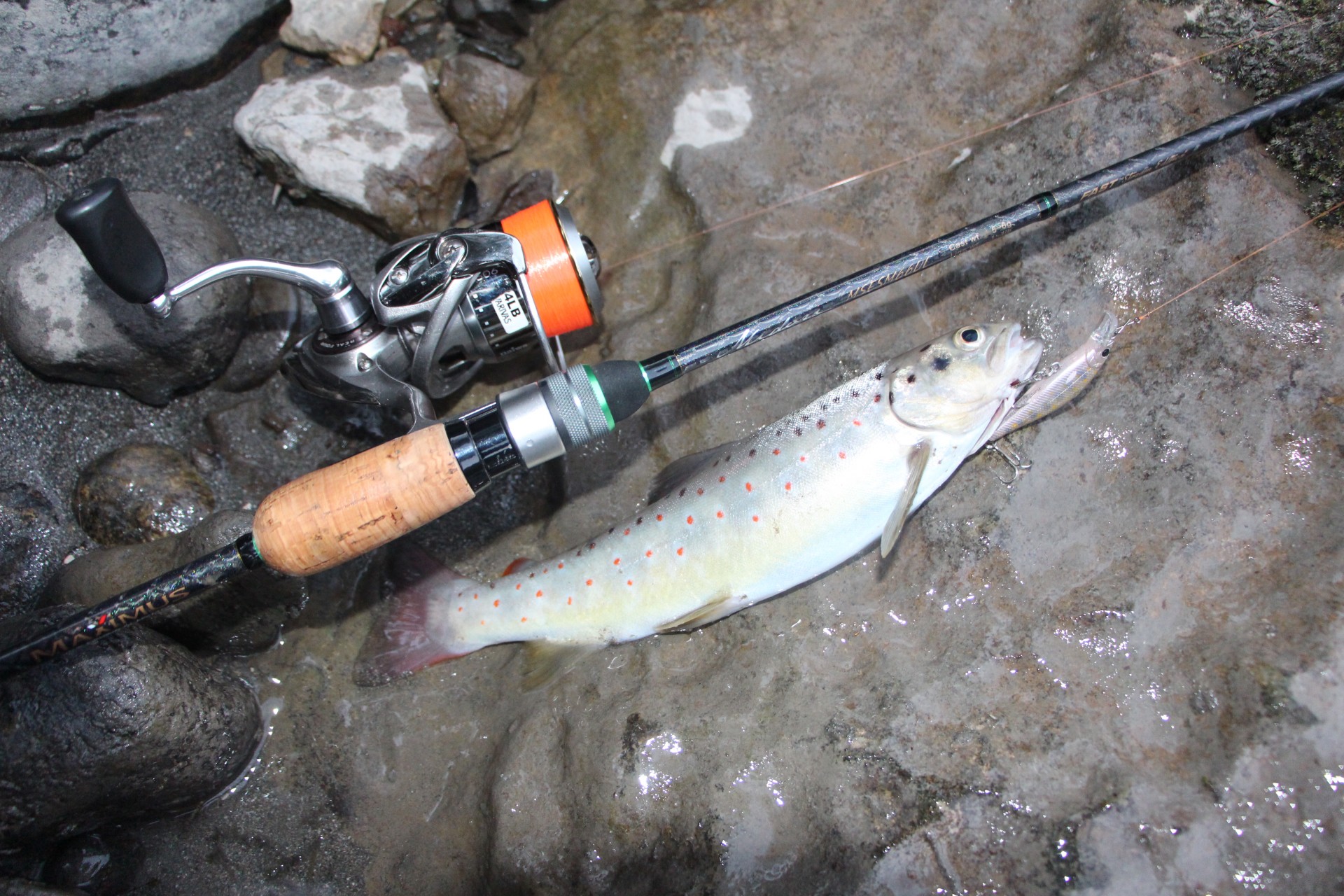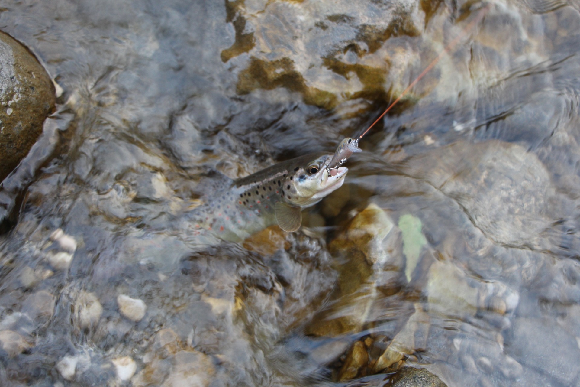 Меняю приманку на тонущий минноу. Проводка вдоль камешков с периодической отдачей вершинки спиннинга. Приманка играет на одном месте, подхваченная течением. Есть!