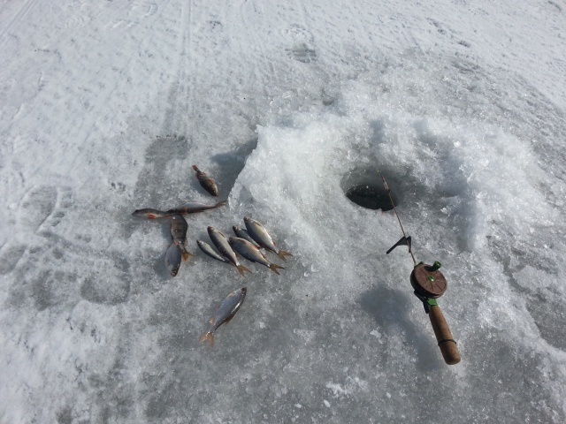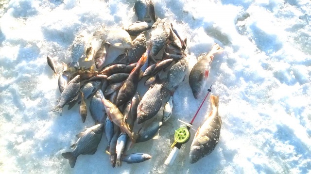 Вот здесь то и оторвались по чебаку,жаль,что с основном-мелковат.Иногда покрупнее попадался.Весь народ,в основном,тоже к обеду переместился ближе к выходу со льда к стоянке и развлекался ловлей чебачка и лаврушки.Изредка проскакивали экземпляры покрупнее,но это изредка и у немногих счастливчиков.