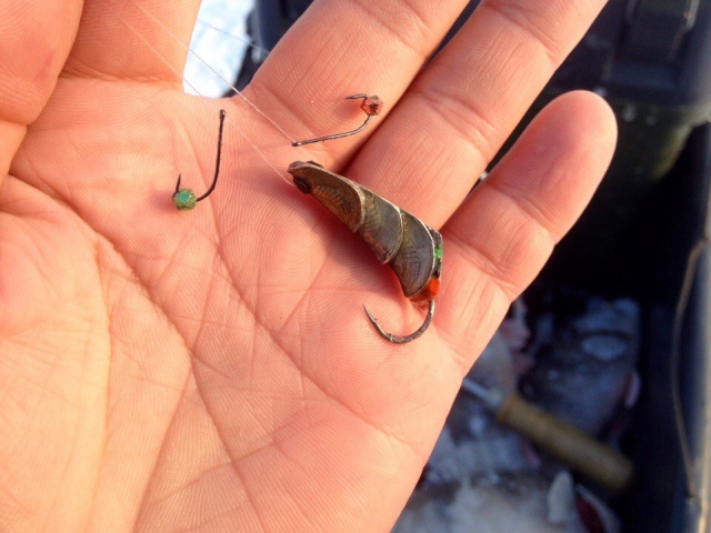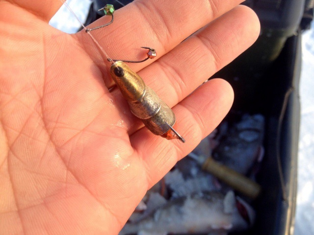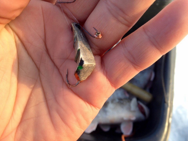 А я опять на Маяке был, который в р-не Курумоча, снова на гондурас, сегодня одинадцать окуней, почти три с половиной кило, самый большой 550 грамм. Выяснилось, что лучше и крупней ловится на крупный гондурас. С утра вхолостую ходил,одного вытащил, после гондурас побольше повесил, дело пошло. На глубине с течением маленьким плохо ловить - сносит. И не клюет. Вернее клюёт, но редко. На фото мой гондурас, спаял года два назад, только сегодня испытал, берёт взаглот его, саму блесну. Надо ещё таких наделать, а то в единственном экземпляре, было два, один подарил.
