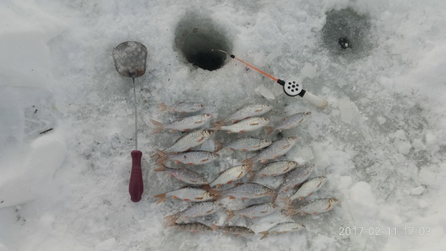 Вчерась выбрался на т.б. Маяк. Окунь поклёвывал до 10:30 потом уснул. Крупного не было. После обеда нашел лунку с лодошечной густерой.