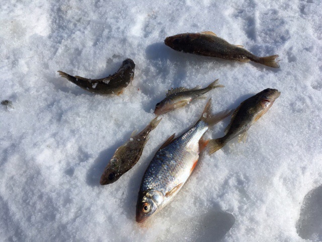 Вчера рыбачили с братом под п.Чкалова. Выставили жерлицы и начали рыбачить на мормышку с мотылём. Часа за полтора ни одной поклёвки ни на что. Я уже всякую надежду на поклёвку потерял, решил перебрать удилки в ящике. Тут брат подошёл с одной пойманной плотвичкой. Решил заменить карася на жерлице на пойманного местного обитателя. Ещё где-то через часок загорелся флаг, именно на той на которой в качестве живца была плотва, хотя карасёвых жерлиц было 15. Подхожу - катушка крутится, подсечка и на другом конце приятное сопротивление, по ощущениям хорошо за кг., но в реальности проверить не удалось, сход у самой лунки. Пошёл к брату проверить не поймал ли он ещё плотвы в качестве живца, но у него только три живцовых окуня. Заменил ими карасей на жерлицах. Сам в пылу азарта начал более активно искать по водоёму плотву. Пробил пяткой одну из старых лунок, так что лунка получилась см. 7 в диаметре и как раз на ней лютая поклёвка. Тяну очень аккуратно а рыб временами встаёт мёртво так, что старая китайская леска 0,12 мм при большей нагрузке может не сдюжить. Сам думаю если на другом конце подлещик, то явно в старую лунку не пройдёт, а под рукой ничего нет чтобы расширить края лунки. Вскоре в лунке показывается щучья голова и щучка на 700гр. на льду. В первый раз щучку выловил на мормышку с мотылём, да ещё с 5 метровой глубины. До конца рыбалки заменил почти всего карася на жерлицах на окуней и плотву, но поклёвок так больше и не было.
