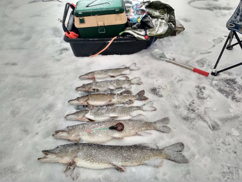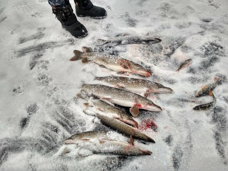 Зимний сезон открыт. Хорошо ловятся щука, сорога, окунь. Лёд около 15см, покрыт снегом. На фото уловы рыбаков.