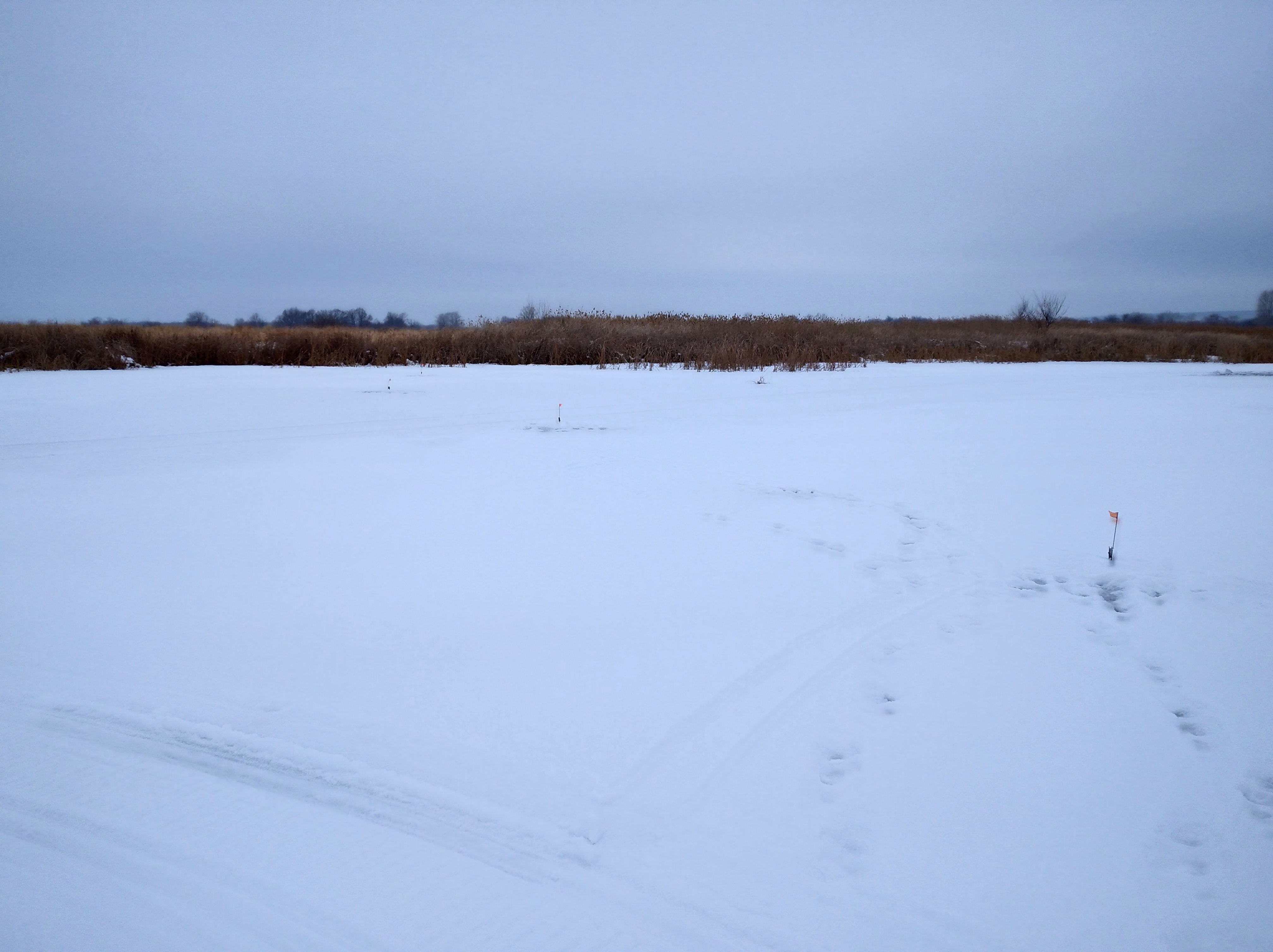 Вешки на Прорве в конце Владимировки выставлены от берега до берега. Самый тонкий лёд под берегом села и возле трещины. Пока оттепель, переходить лучше с пешнёй. У берега и в островах у камыша на льду вода.