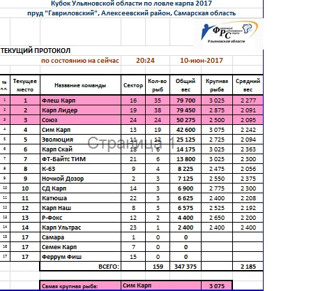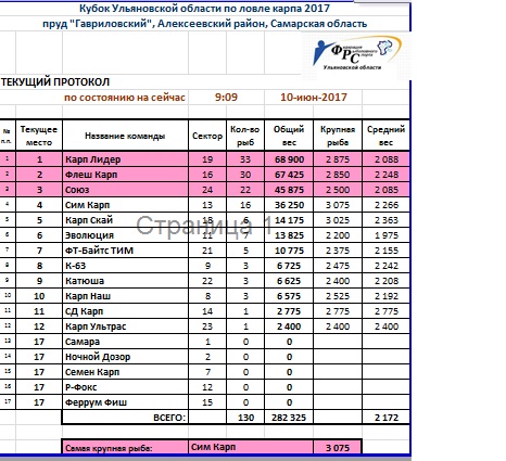 Добавлено: 10 Июня 2017, 11:33:44 Сейчас на промежуточном взвешивании 16-ый сектор, Флеш Карп, Самара, немного, примерно на 3-4кг, обошел 19-ый сектор, КарпЛидер, Димитровград.