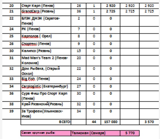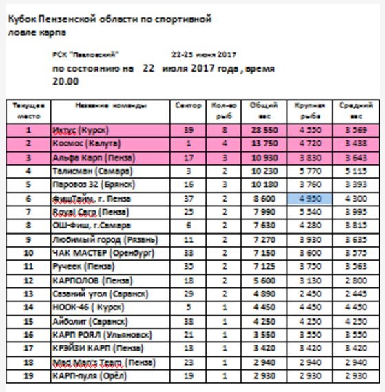 Вице биг-фиш на кануне на 7.3кг. и остальной улов 24-го июня позволяли надеяться по крайней мере на 12 место. Утром общались с Курском, последняя ночь у них прошла спокойно, как и у нас. Утром мы взяли 1 рыбу стандартную.