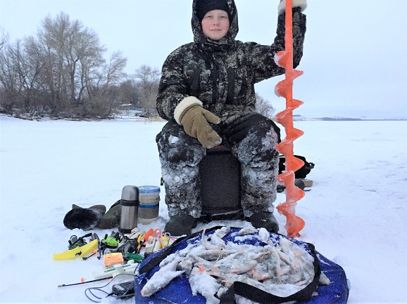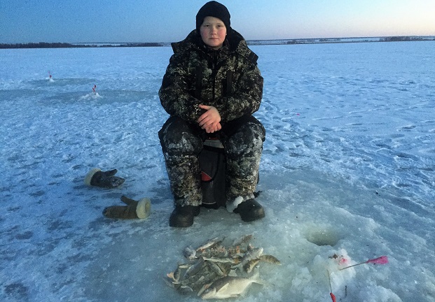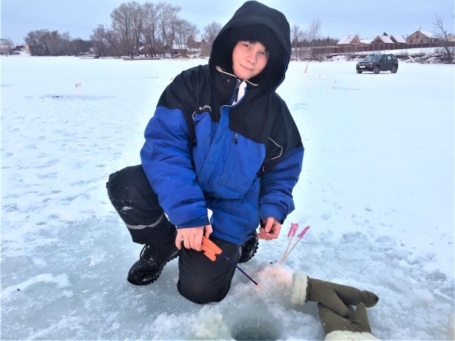 Вовка бурил сам, неплохо искал и ловил некрупного окуня и ерша Попадались и с ладонь. Получил огромное удовольствие! Думаю, теперь будет проситься на каждую рыбалку!