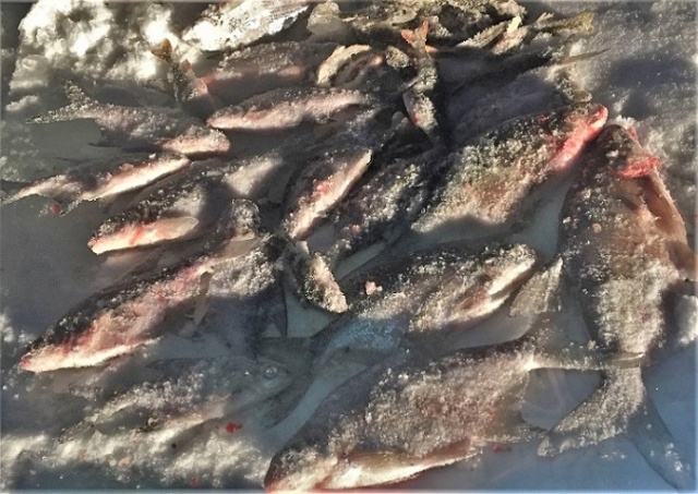 Две чуть более кило, одна 1,610 кг. Соседи подняли пару щучек более трех кг. и около десятка от 1кг до 2,5 мелочь отправлялась за родителями. После 12 до 15-20 было всего четыре флага все в пользу щурки. Два обрыва лески 0.5. Один когда выдирал, а вот второй- выводил с начало очень легко, затем резкий рывок и леска прорезала палец, затем еще пару рывков и вся оснастка осталась щурке на память. Да поначалу две жерлички поставил на границе камыша и чистой воды- до 12 ни одного флага. Переставил в камыши и через 10 минут на одной из них флаг. В 15-10 начал собираться домой. Соседи ходили на чистый лед ловить малька, пришли в расстроенных чувствах вместо малька два окуня грамм по 400 и три сорожки грамм по 250. Я им сдал в аренду две лунки кормленых в которых мелкая сорога клевала как из пулемета, лунки также в камышах. На балансир ни единой поклевки. Перепробовал весь арсеналю Вот такая праздничная рыбалка получилась.