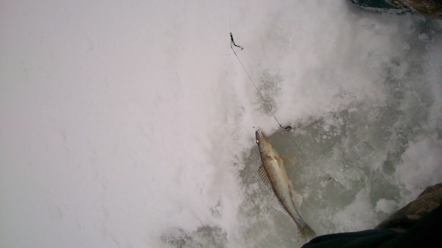 . Пошли ходит бродить искать рыбацкое счастье. Правда ходить и бродить сказано очень сильно, буквально на 3-4 лунке ножи на втором буре скоропостижно погибают. Ну трындец, на рыбачились. Алексей что-то намаркетанил с буром и отправился искать рыбу. Я же принял решение искать свою (ну как свою?! Старую не замерзшую чужую) лунку на интересном месте. И о счастье, находится таковая. Разбурил кое как, опускаю снать первая проводка и опа четкая поклевка, поднимаю судачка в 55 см. роста. Хорошо! Опускаю в эту же лунку снасть и на следующей проводке садится ещё один судачок, чуть меньше в 50 см. ростом.