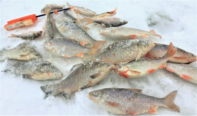 В течении 2-х часов у меня были поклевки во всех 6 прикормленных лунках, поймал 4 неплохих сорожки.