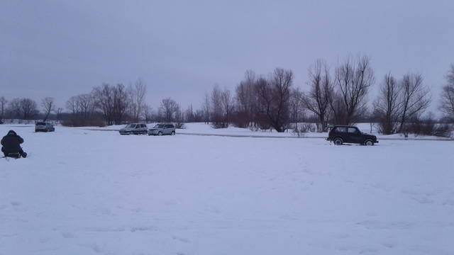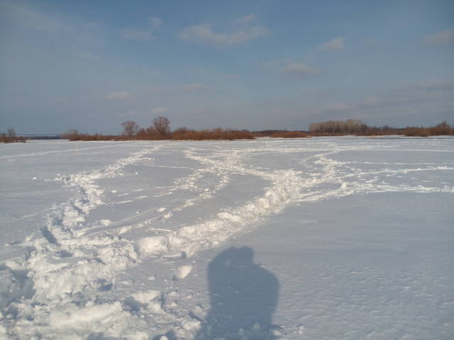 . Мой размер (47) среди родственников искать было без толку, одна надежда на зимние кроссовки в которые был обут и малое количество воды под снегом на водоёме. В общем по прибытии к тёще, быстро пообедав , переоделся, собрал "собача" и в путь до озера, благо дорогу до этого в четверг по чистили, перемёты присутствовали но на ниве можно было проехать( чем на следующее утро и воспользовался, спасибо тестю