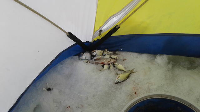 , время 5 вечера, начало есть. Тут и сорога стала поклёвывать живцового размера, меняю живца на четырёх дальних, притопал глотнул чайку, флаг на только поменяной , помчался обратно , катуха визжит, подсечка и что-то упёрлось , не хочет заходить в лунку, раза с пятого завёл, где то в районе трёшки.Часам к шести поменял всего живца и доставил ещё две жерлички. Звонок и на том конце говорят , не пора бы вам пора, натопленная банька и холодное пенное ждут