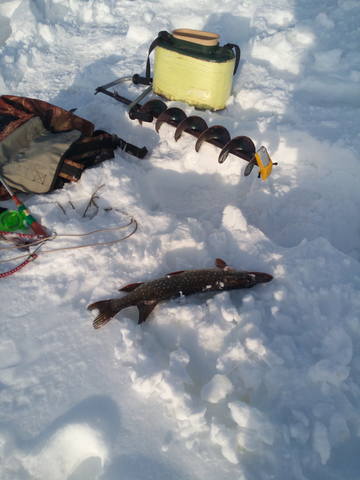 , пришлось кормить и идти искать окушка. И тут первый "бздынь", не большая пробежка в снегу по колено и водой под ним, катушка медленно но уверенно крутится,подсечка и первая на свежем воздухе