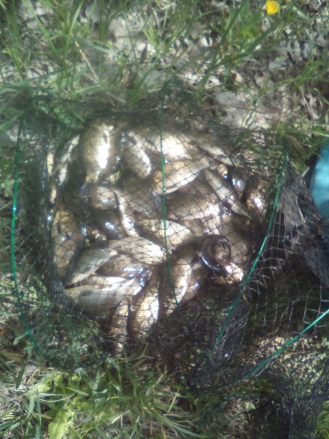 Возился довольно долго. Леха к моменту, когда я поймал первого карася (200г) уже 2 раза подъезжал к садку, привязанному к колу и перекладывал пойманных карасей. Сказал, что поймал уже штук 30 карасей по 200-350г.