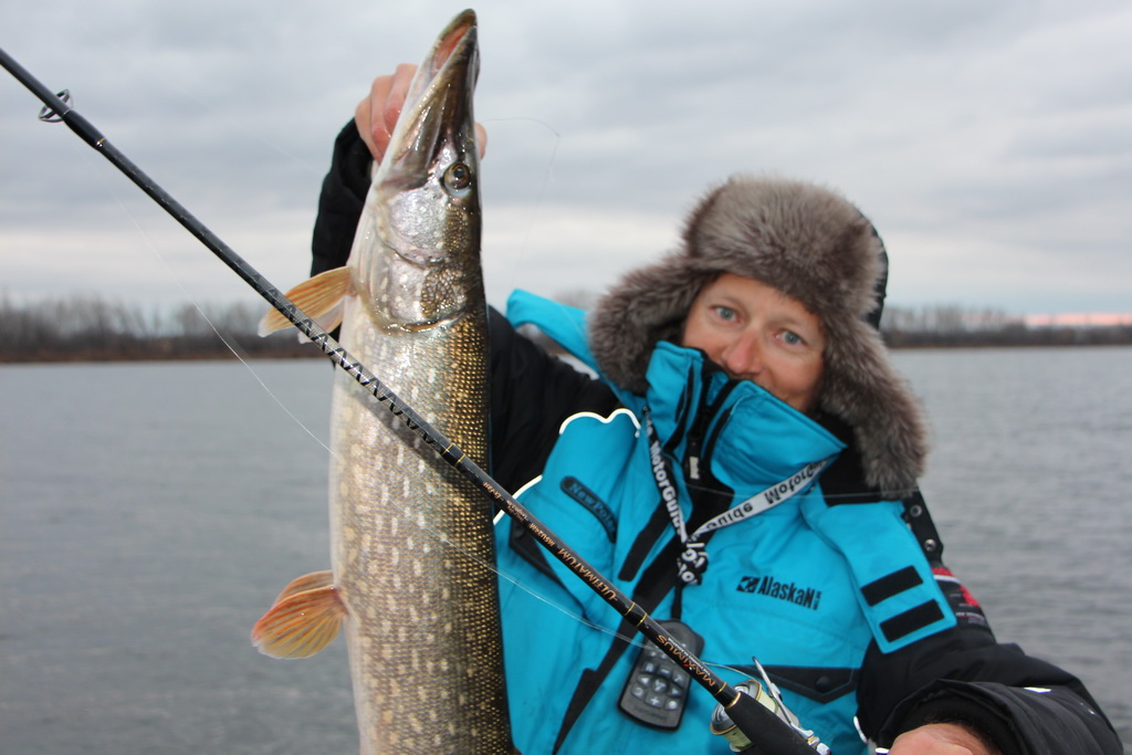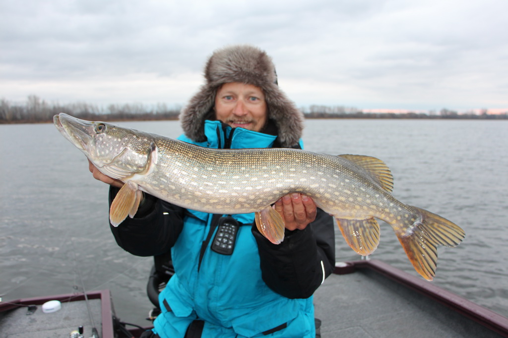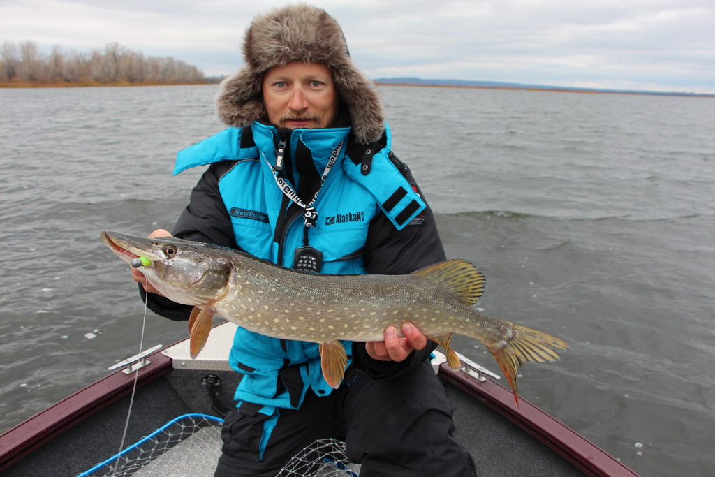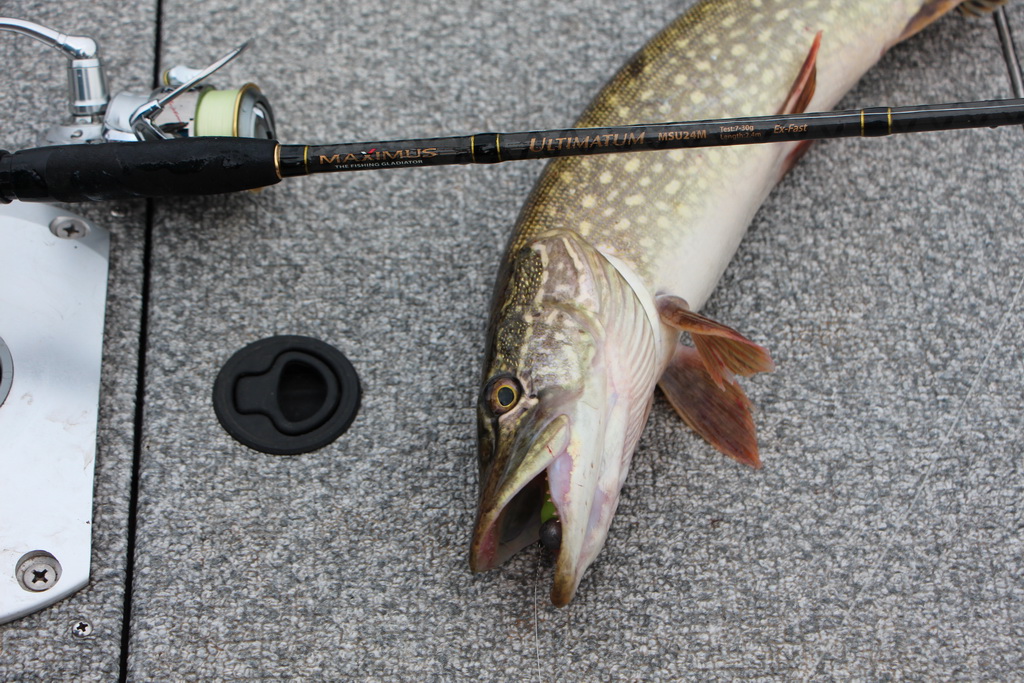 Вновь переставляемся, также ориентируясь по карте вдоль свала. Заброс. Пару оборотов. Пауза! Удар! Есть! Очевидно щука покрупнее! На этот раз не тороплюсь, помня предыдущий сход хорошей рыбы. Неспеша подвожу к подсаку, где напарник уже на готове ловким движением берет рыбу в подсак.