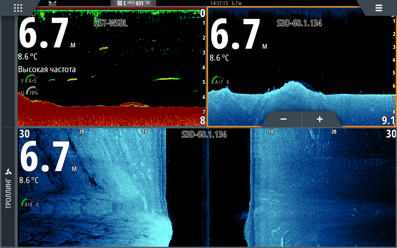 Еще несколько забросов приносят щучек поменьше. Перемещаемся. Но ан новой постановке только пару холостых поклевок. Еще одна перестановка вдоль свала. На этот раз не результативная. Проверяем «электронными глазами» Lowrance StructureScan 3D и сонаром. Тут рыбы уже нет.