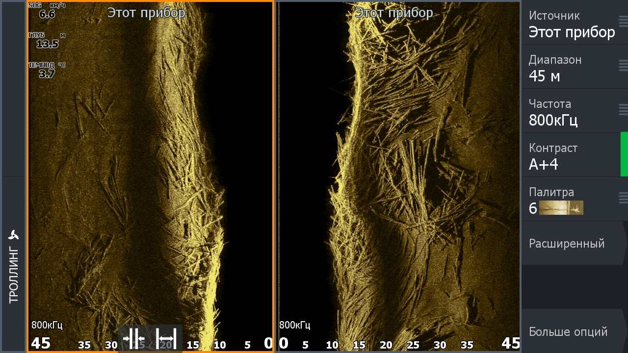 5. Мутная вода на аппаратах Ti и Hook2 на частоте 455 довольно сильно влияет на картинку. На 800 значительно падает ширина обзора. Она сравнима с Хамовским на Меге. Она дает выше детализацию на этих аппаратах. StructureScan 3D дает более чистую картинку на всех диапазонах расстояний, но работает только с аппаратами HDS. Новый датчик Active Imaging lowrance поднимает сканирование в новых аппаратах Ti2 на новый уровень без дикого завышения частот и на значительно большем расстоянии чем Мега. Также, этот датчик будет работать и на HDS. Если очень нужно иметь высокие частоты можно использовать датчик Active Imaging в паре с 3D и даже заменить им датчик сонара, поскольку есть вариант комбинированного 3в1: сонар, боковик и нижний.