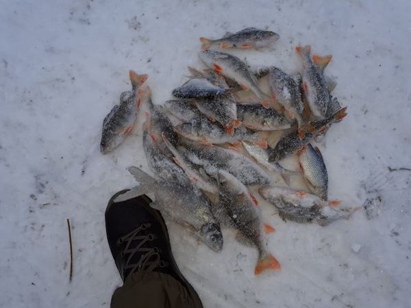 . Один не достаток , одной свечей не прогреешься , надо что то по мощнее. Да юбку нечем было присыпать , а таскать снег за 50 метров не хотелось. По рыбе , в основном густерка , сорожки мало было . Под вечер попался голавлик и красноперка. В перерывах от созерцания кивков бегал по лункам в поисках окуня, иногда находил