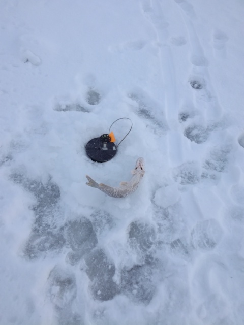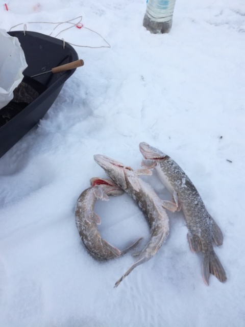 Добрый день! В субботу решил съездить порыбачить на жерлицы. Расставился затемно. Лед сверху с водой, бурить одно мучение, да еще и мороз -20 с ветром. Рыбалка экстремальная. Первый флаг загорелся на рассвете. Что интересно, с одной лунки затем поймал еще 3 шт. Остальные молчали. Клев слабенький, да и щука в пиявках-стоит.