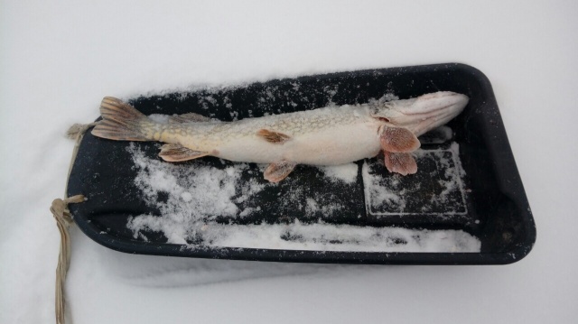 Но нет препятствий патриотам, в заботливо запасенной мною фляжке 200 грамм гранатовой водки, я давно рекламировал другу этот напиток и вот час настал. Спустившись на лед мы....и в свете налобника я вижу, как жизнь возвращается в это тело, крепнет голос, блеском и решимостью наполняются глаза. Полные сил и энергии мы решительно шагаем по тропе наперекор стихии, прям как герои Джека Лондона. В 7.20 на месте, кормим 7 лунок и....вот тут то я и удивился, поклевки сорожки в темноте были и настолько решительные и уверенные, что я думал, что сейчас рассветет и попрет со страшной силой, но к 8-ми клев стал затихать и к 8.30-ти сошел на нет. Кстати, все поклевки щуки пришлись на тот же период, за весь день после не было больше ни одной! Но утром была вакханалия клева! Казалось, что счастье только начинается. Следующий удар под ложечку нанес нам окунь, после затихания клева сорожки и щуки, мы выдвинулись на вчерашнее место ловли окуня и действительно не ошиблись. Мало того, что лед там напоминал решето, так еще там суетился чел из вчерашних на мотособаке....но ни мы, ни коллега, косившийся на нас, как на немцев под Сталинградом, не преуспели. Народ начал сматываться уже к 12-ти, мы продержались до 15-ти часов дня. Итогом дня стали 4 щуки, одна неплохая и прямо таки королевский ерш взятый Серегой на мотыля.
