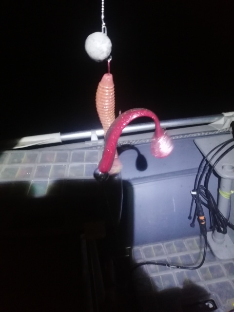 Из интересного напарник оторвал джиголовку с приманкой. Через несколько смен точек вернулись на прежнюю и я её отцепил с коряги своей приманкой при проводке.
