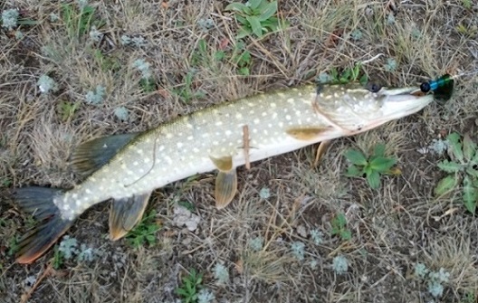 И в 09:30 случилось нечто: я долго смотрел на квивертип который не двигался, решил перезабросить фидер, на всякий случай немного подсёк и стал выматывать но не тут то было, кто то на том конце решил иначе и стал сматывать плетенку со шпули!!! Фрикцион затянул немного сильнее, но не помогло, кто то упирался очень сильно! Потом через 3 минуты дело пошло лучше, бревно стало приближаться и мне было жутко интересно кто там был!!! Рывков не было, просто давила вниз и иногда так что мотать было невозможно! Я, испытав незабываемые ощущения кричу другу- возьми мою удочку!!! Сам взял подсак и полез в воду, что бы в траве не оставить трофей! Через 10-15 минут ходьбы в воде с подсаком я наконец то увидел кто там был на крючке- это была огромная щука (как мне показалось, потому что вживую я крупней не видел ни разу). После первого неудачного движения подсаком щука рванула в сторону и сделала передо мной такую красивую свечку, метрах в трёх- четырёх от меня! И все же мне удалось посадить щуку в подсак и вытащить её из воды!!!!!!