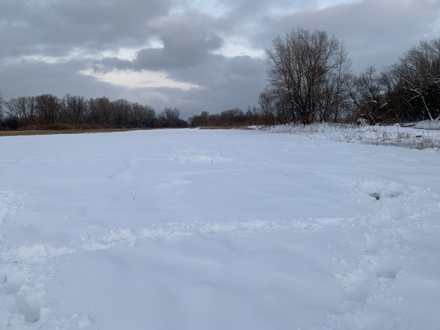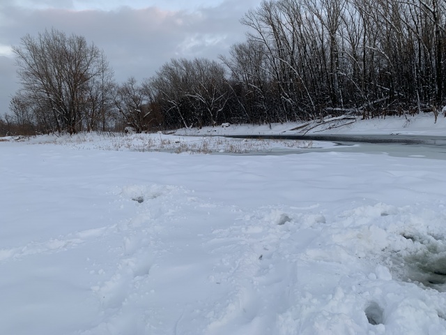 Лед различной толщины , середина Кривуши - открытая вода, с утра парила.