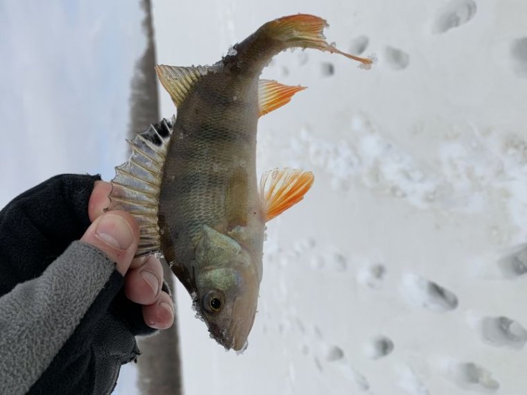Лед еще толстый на водохранилище поэтому не упустил свой шанс половить окуней с икрой.И как бонусом берш 800 грамм и такой же сход. На балансиры плохо реагировала а вот вертикалку маропедку съедала взаглот. Также эту блесну жрал сопливы ерш и не плохо
