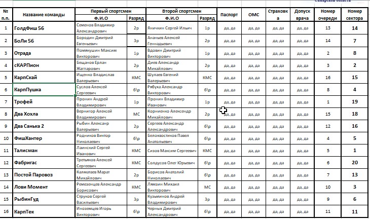 Резерв : 1. Команда "Фишинг Лайф" г.Салават. Литвиненко А. В. б/р, Шеметов М. Ю. б/р