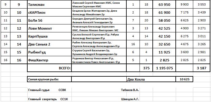 итоговый протокол Соревнований Самарской области (ловля карпа-парные) 24-27 июня 2021