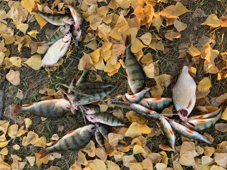 Воскресная рыбалка 17.10.2021 по сравнению с предыдущими была пролетной. С утра в Шалаевском затоне думал половить окуней на нано-джиг, но окунь думал иначе, ловился только окушок до 100 гр, да и то не активно, в траве в обед мелочь гоняли щучьи дети, переместился на русло от перекопа до 22-го партсъезда на джиг от 3,5 до 6 дюймов также болт, двинул на Орлову яму и ее окресности, на яме, на джиг ни тычка, в окресностях на участках глубиной до 1,5 метра, на воблер щупаки грамм до 300 иногда вешались как на фото, и 1 окунек небольшой взял. Спишу пассивность рыбы на погоду))).