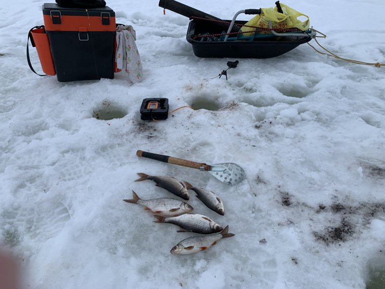 Ловили с глубины 4-5 метров. Впрочем на 3-8 примерно та же история. Основная рыба - густера. Саня ещё поймал пяток приличных сорог. Я - пяток не приличных (утопил). Кроме того обоим попалось несколько загадочных рыбов, что-то среднее между густерой и краснопёркой. Каждую зиму таких ловлю. Что это такое никто толком не знает.