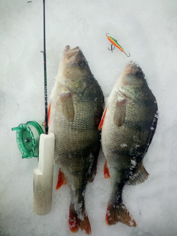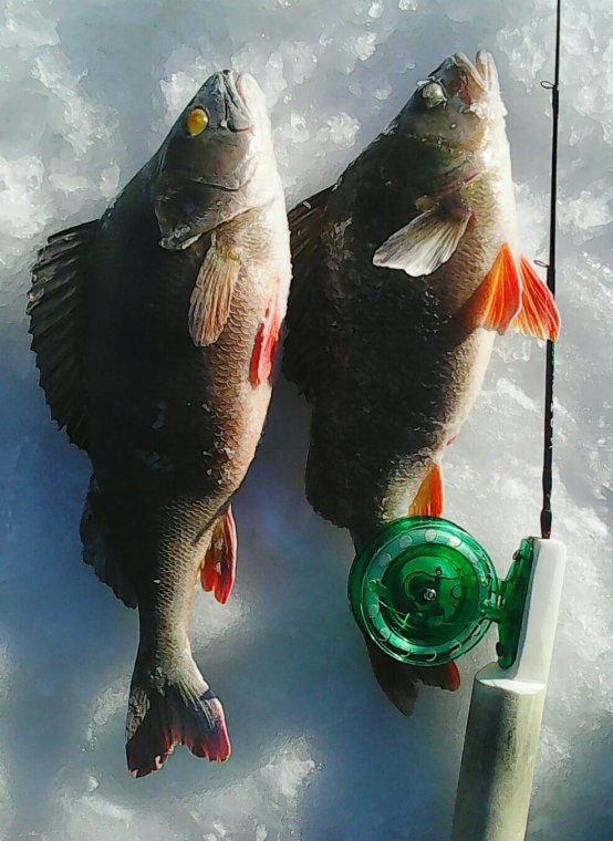 Лезу рукой почти до рукава, а там мой окунь поперёк лунки стоит, башка в прогале между верхним льдом и нижним, а хвост тоже в слое воды между льдом застрял. Я его еле еле вытащил! Минут десять он там торчал!