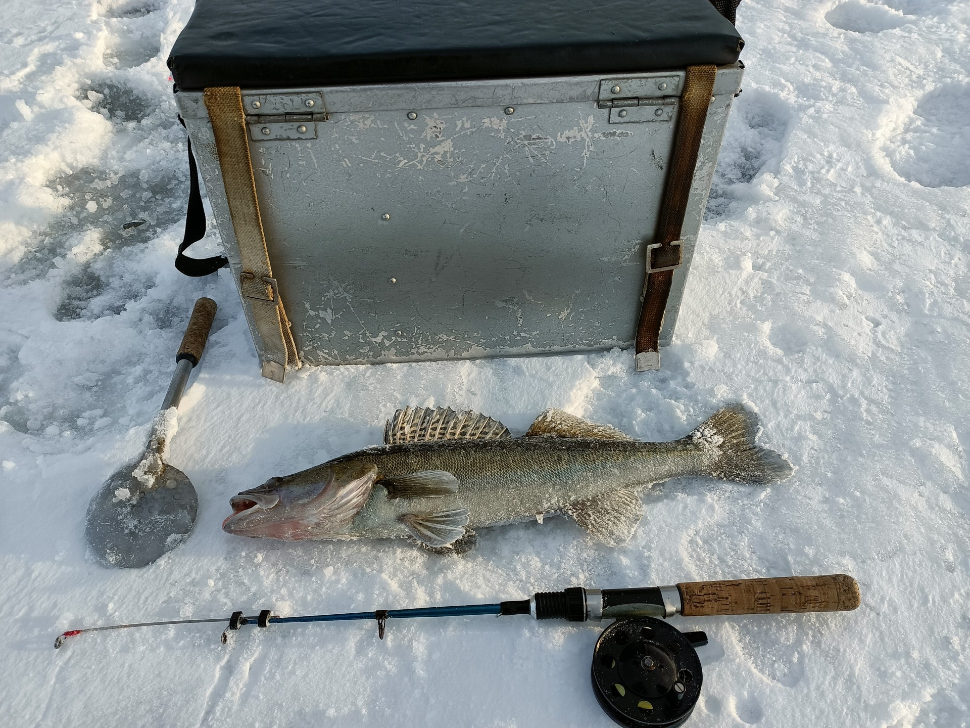 Ну а под самый вечер со мной произошла просто классическая рыбацкая история. Я уже шёл потихоньку в строну машины, проверяя попадавшиеся лунки. И вот в одной обнаружил какое-то шевеление. Опустил удочку. Есть! Густера за ладонь. Но потом совсем какой-то лещ-ушлёпок. А дальше вообще ничего. Чёрт с ним, думаю. Рыбы, вроде, поймал. Перекушу, да к машине. Думаю, все уже поняли, что было дальше.
