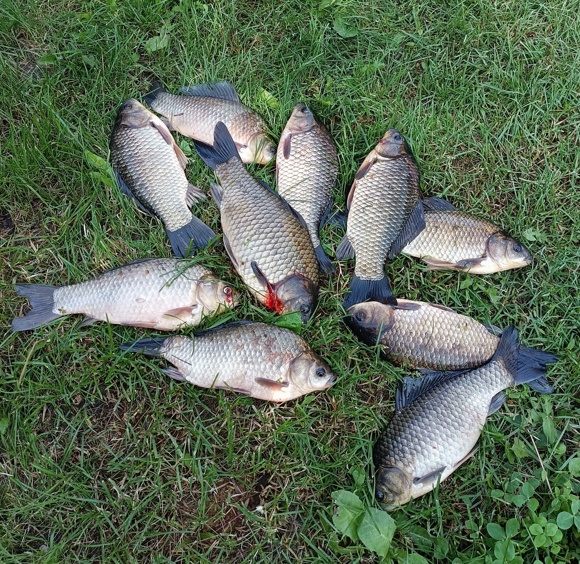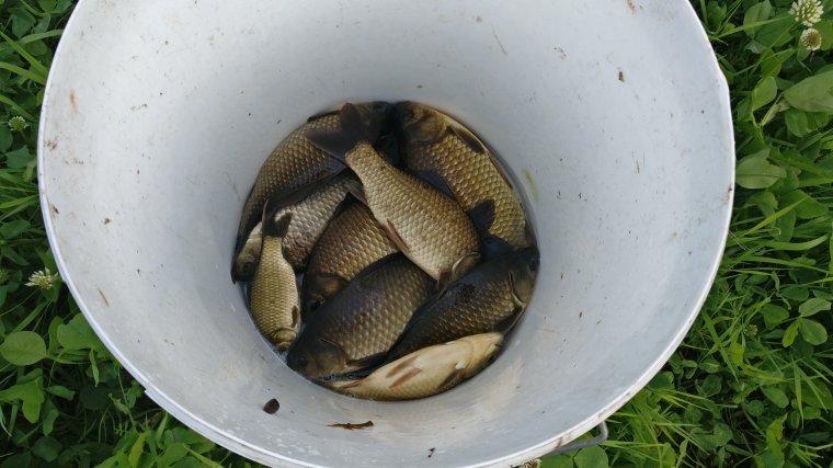 На две удочки ловить было не возможно (вторая лежала рядом с насадкой на случай обрыва). В итоге полста карасиков (в ладонь и чуть мене-боле) поделили с мейкушонком (кошак себе намырчал еще с десяток в процессе ловли, но с ведра не тырил). КотЭ скоро полгода, а он уже раздобрел больше чем смесок сибирского (которому пятый год идет).