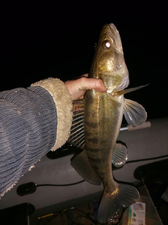 Когда стало хоть что-то видно, двинул продолжать. Сначала нашёл тот самый косяк. Но он оказался практически пустым. Поймал одного килошника. Это был второй удар за эту рыбалку, который я ощутил. Причём взял уже прямо под лодкой, когда я начал играть джигой, как мормышкой.